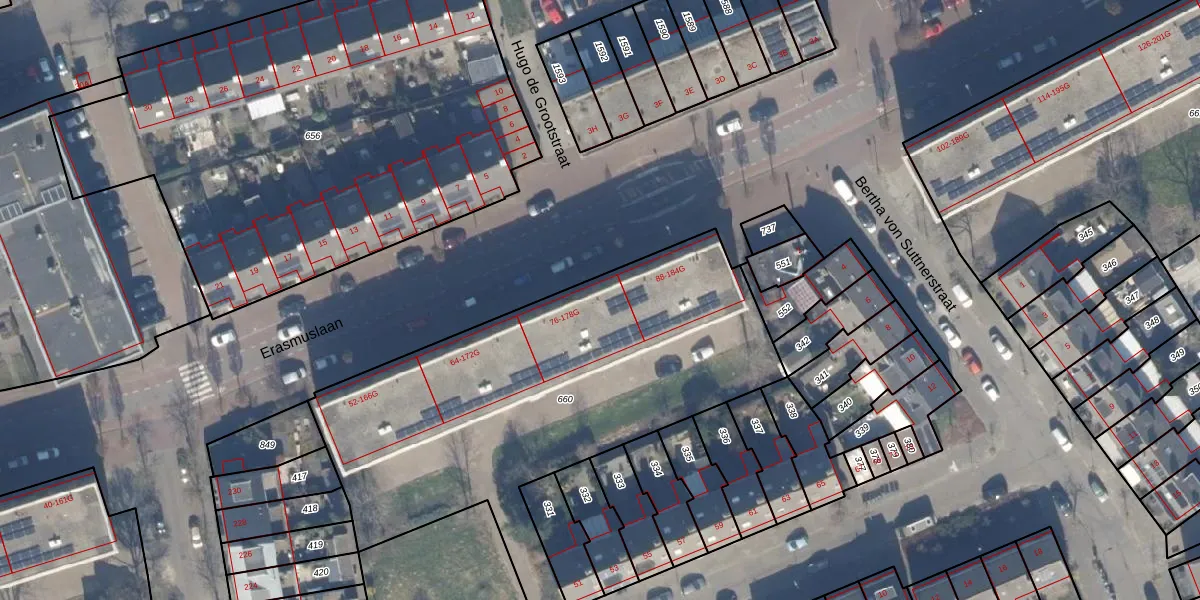 Erasmuslaan 82 is gelegen op kadastraal perceel HLM02X660. Deze kadastrale aanduiding is uniek en wordt gebruikt door het Kadaster om eigendomsrechten en andere zakelijke rechten vast te leggen. Het perceel maakt onderdeel uit van de kadastrale gemeente Haarlem.