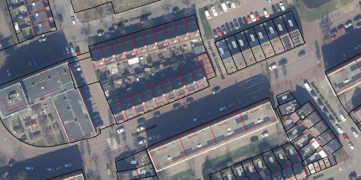 Erasmuslaan 9 is gelegen op kadastraal perceel HLM02X656. Deze kadastrale aanduiding is uniek en wordt gebruikt door het Kadaster om eigendomsrechten en andere zakelijke rechten vast te leggen. Het perceel maakt onderdeel uit van de kadastrale gemeente Haarlem.