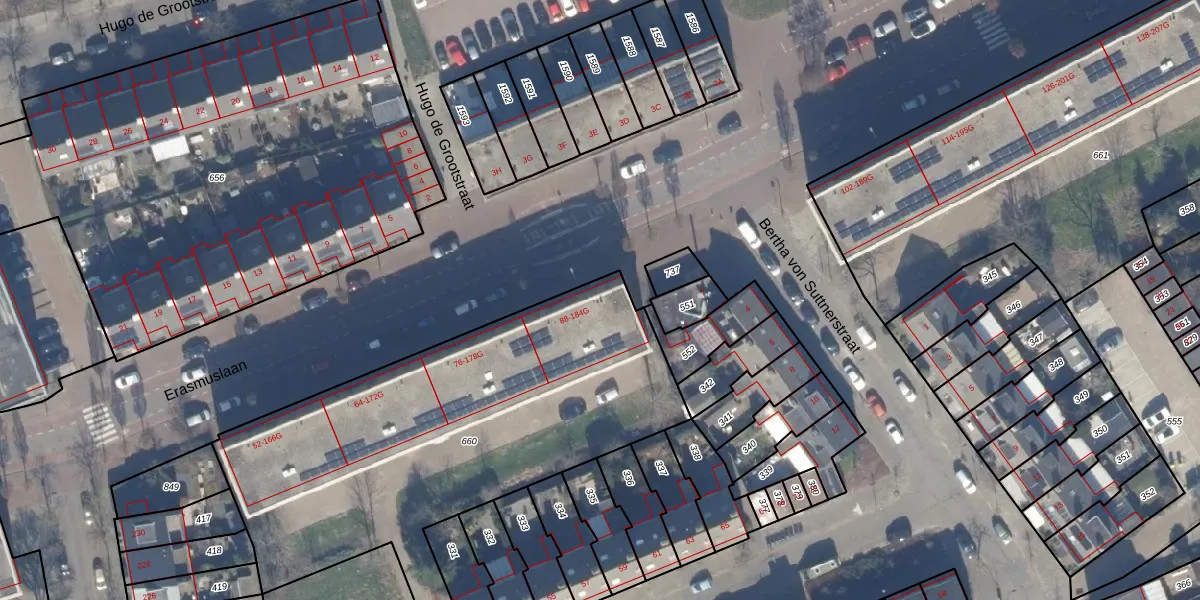 Erasmuslaan 94 is gelegen op kadastraal perceel HLM02X660. Deze kadastrale aanduiding is uniek en wordt gebruikt door het Kadaster om eigendomsrechten en andere zakelijke rechten vast te leggen. Het perceel maakt onderdeel uit van de kadastrale gemeente Haarlem.