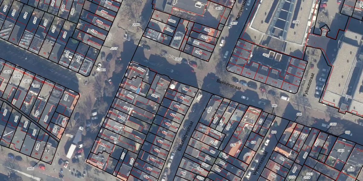 Esschilderstraat 2-B is gelegen op kadastraal perceel HLM01K416. Deze kadastrale aanduiding is uniek en wordt gebruikt door het Kadaster om eigendomsrechten en andere zakelijke rechten vast te leggen. Het perceel maakt onderdeel uit van de kadastrale gemeente Haarlem.