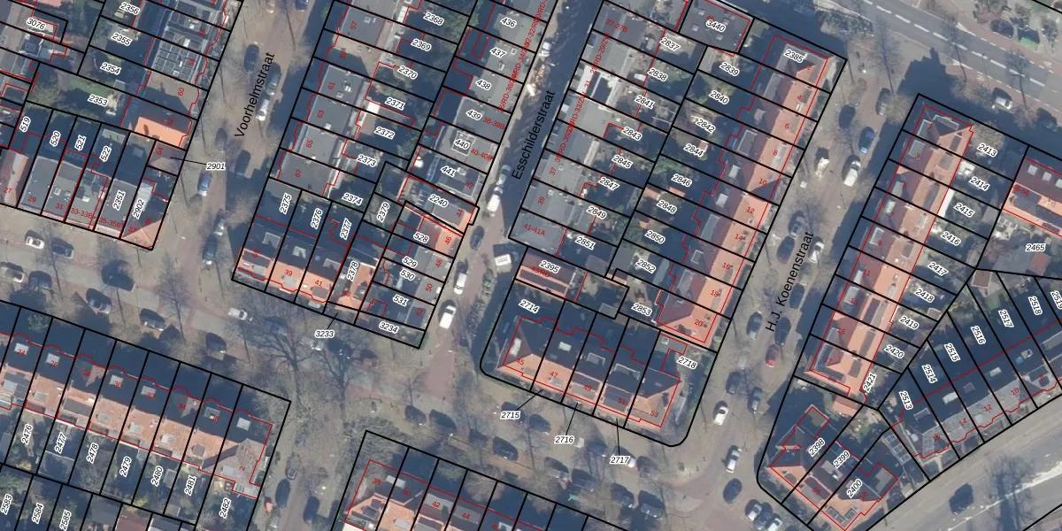 Het perceel waarop Esschilderstraat 43 staat heeft een oppervlakte van 133 m². Dit is een middelgroot perceel. De perceeloppervlakte wordt geregistreerd door het Kadaster. Gedetailleerde informatie over de maten van dit perceel kunt u vinden in het rapport Kadastrale kaart met maatvoering van Esschilderstraat 43.