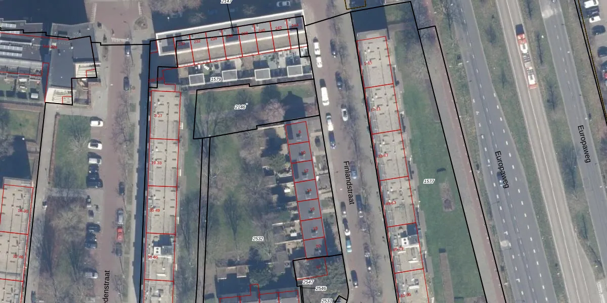 Het perceel waarop Finlandstraat 10 staat heeft een oppervlakte van 2494 m². Dit is een zeer groot perceel. De perceeloppervlakte wordt geregistreerd door het Kadaster. Gedetailleerde informatie over de maten van dit perceel kunt u vinden in het rapport Kadastrale kaart met maatvoering van Finlandstraat 10.