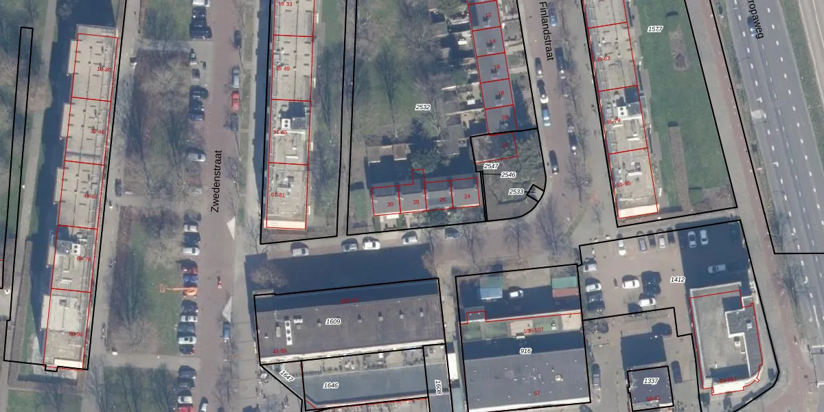 Het perceel waarop Finlandstraat 28 staat heeft een oppervlakte van 2494 m². Dit is een zeer groot perceel. De perceeloppervlakte wordt geregistreerd door het Kadaster. Gedetailleerde informatie over de maten van dit perceel kunt u vinden in het rapport Kadastrale kaart met maatvoering van Finlandstraat 28.