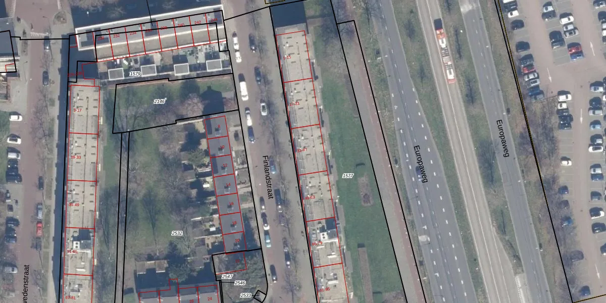 Het perceel waarop Finlandstraat 39 staat heeft een oppervlakte van 2601 m². Dit is een zeer groot perceel. De perceeloppervlakte wordt geregistreerd door het Kadaster. Gedetailleerde informatie over de maten van dit perceel kunt u vinden in het rapport Kadastrale kaart met maatvoering van Finlandstraat 39.