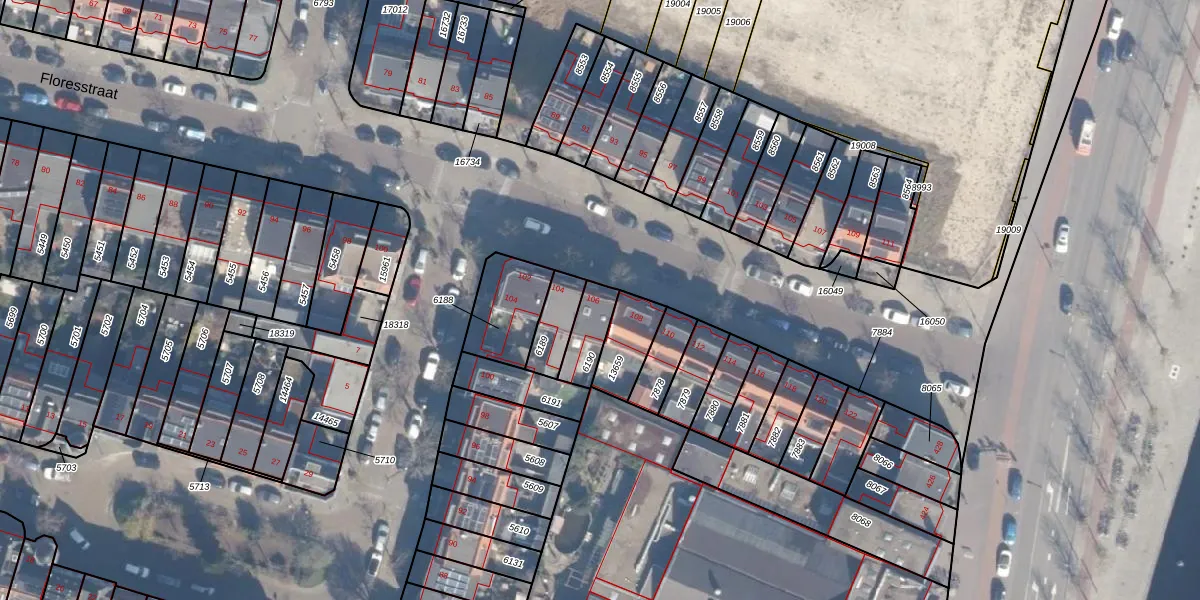 Het perceel waarop Floresstraat 106 staat heeft een oppervlakte van 99 m². Dit is een klein perceel. De perceeloppervlakte wordt geregistreerd door het Kadaster. Gedetailleerde informatie over de maten van dit perceel kunt u vinden in het rapport Kadastrale kaart met maatvoering van Floresstraat 106.
