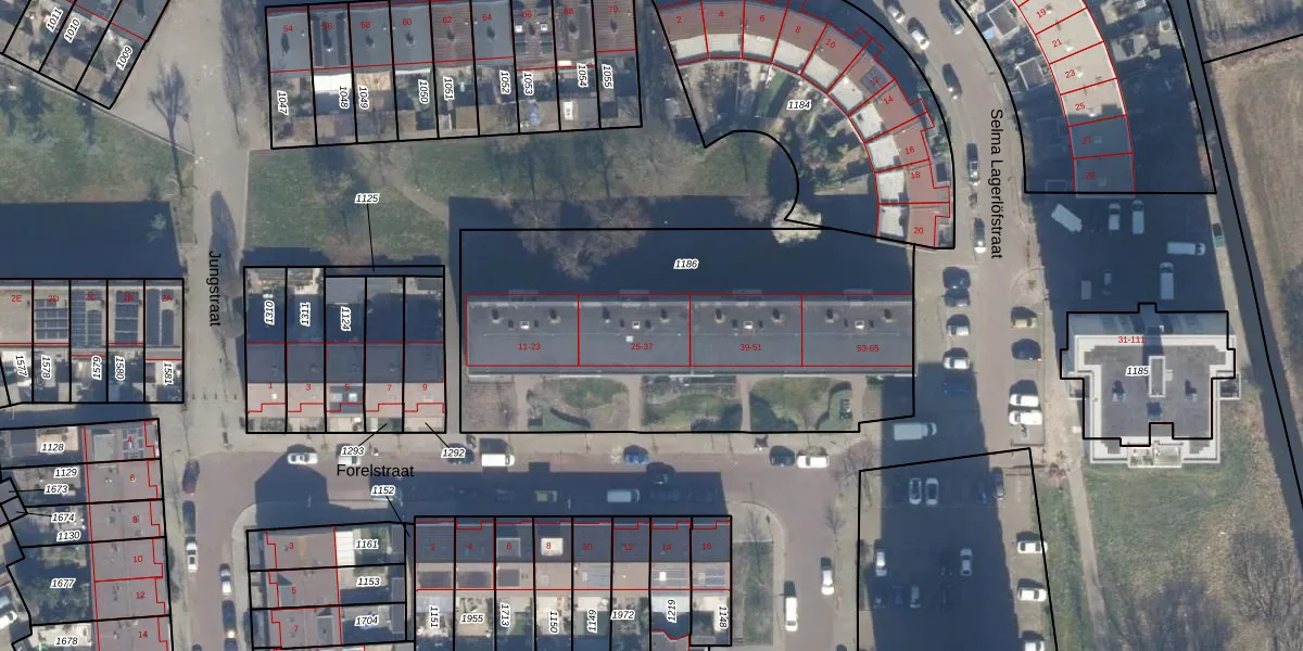Het perceel waarop Forelstraat 35 staat heeft een oppervlakte van 2153 m². Dit is een zeer groot perceel. De perceeloppervlakte wordt geregistreerd door het Kadaster. Gedetailleerde informatie over de maten van dit perceel kunt u vinden in het rapport Kadastrale kaart met maatvoering van Forelstraat 35.