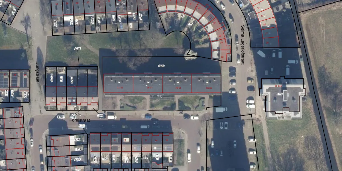 Het perceel waarop Forelstraat 41 staat heeft een oppervlakte van 2153 m². Dit is een zeer groot perceel. De perceeloppervlakte wordt geregistreerd door het Kadaster. Gedetailleerde informatie over de maten van dit perceel kunt u vinden in het rapport Kadastrale kaart met maatvoering van Forelstraat 41.