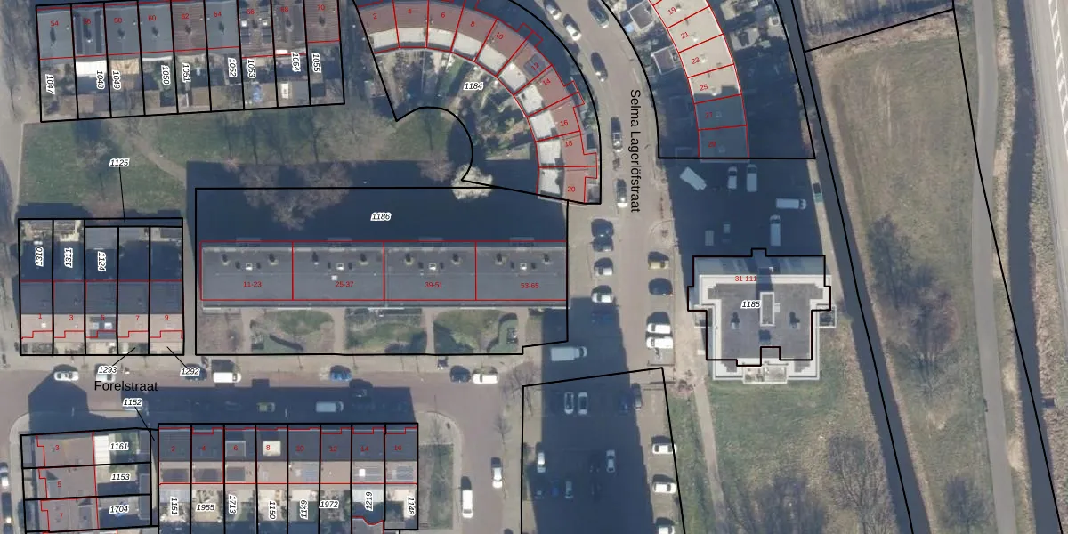 Het perceel waarop Forelstraat 63 staat heeft een oppervlakte van 2153 m². Dit is een zeer groot perceel. De perceeloppervlakte wordt geregistreerd door het Kadaster. Gedetailleerde informatie over de maten van dit perceel kunt u vinden in het rapport Kadastrale kaart met maatvoering van Forelstraat 63.