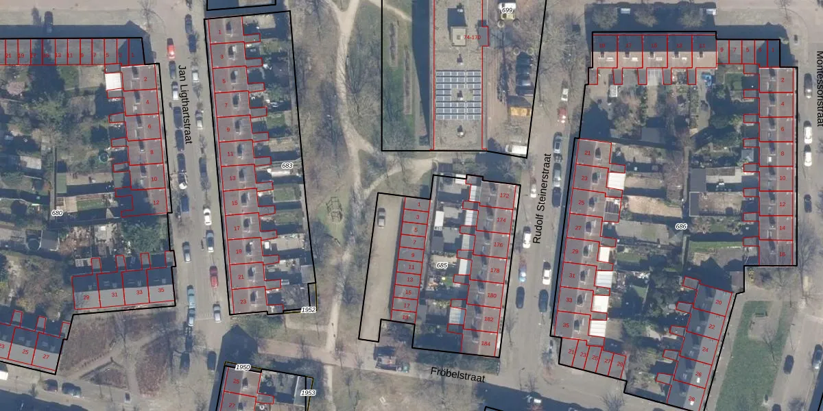 Het perceel waarop Fröbelstraat 1 staat heeft een oppervlakte van 1320 m². Dit is een zeer groot perceel. De perceeloppervlakte wordt geregistreerd door het Kadaster. Gedetailleerde informatie over de maten van dit perceel kunt u vinden in het rapport Kadastrale kaart met maatvoering van Fröbelstraat 1.