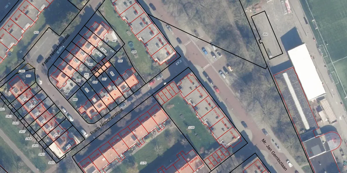 Het perceel waarop Frans Netscherstraat 1 staat heeft een oppervlakte van 1473 m². Dit is een zeer groot perceel. De perceeloppervlakte wordt geregistreerd door het Kadaster. Gedetailleerde informatie over de maten van dit perceel kunt u vinden in het rapport Kadastrale kaart met maatvoering van Frans Netscherstraat 1.