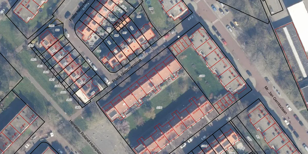 Het perceel waarop Frans Netscherstraat 15-A staat heeft een oppervlakte van 3307 m². Dit is een zeer groot perceel. De perceeloppervlakte wordt geregistreerd door het Kadaster. Gedetailleerde informatie over de maten van dit perceel kunt u vinden in het rapport Kadastrale kaart met maatvoering van Frans Netscherstraat 15-A.