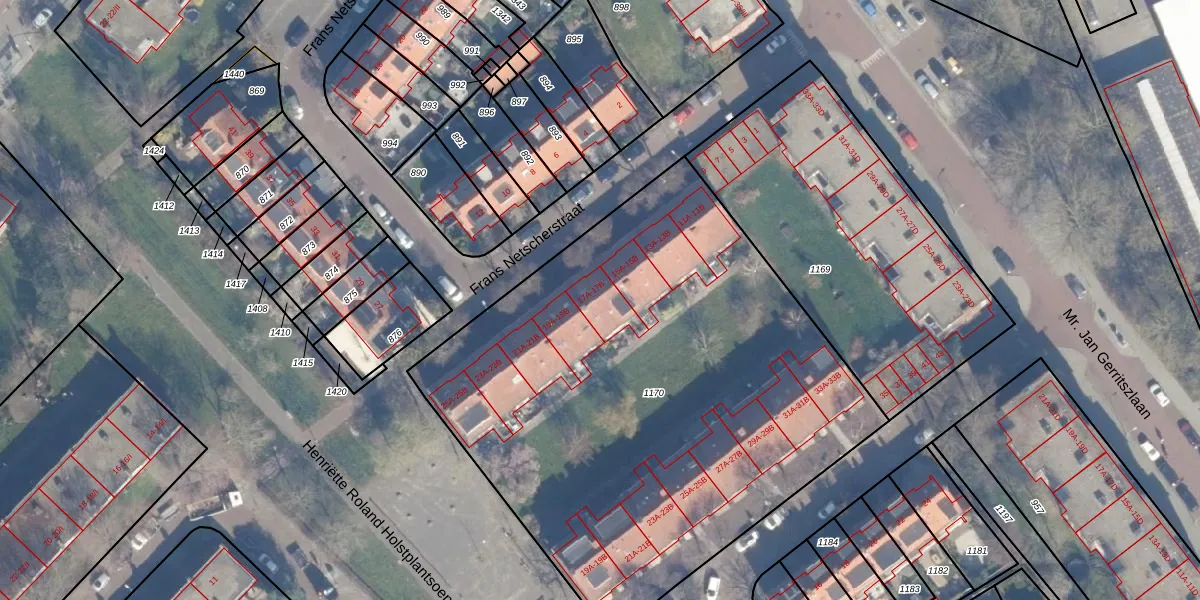 Het perceel waarop Frans Netscherstraat 17-A staat heeft een oppervlakte van 3307 m². Dit is een zeer groot perceel. De perceeloppervlakte wordt geregistreerd door het Kadaster. Gedetailleerde informatie over de maten van dit perceel kunt u vinden in het rapport Kadastrale kaart met maatvoering van Frans Netscherstraat 17-A.