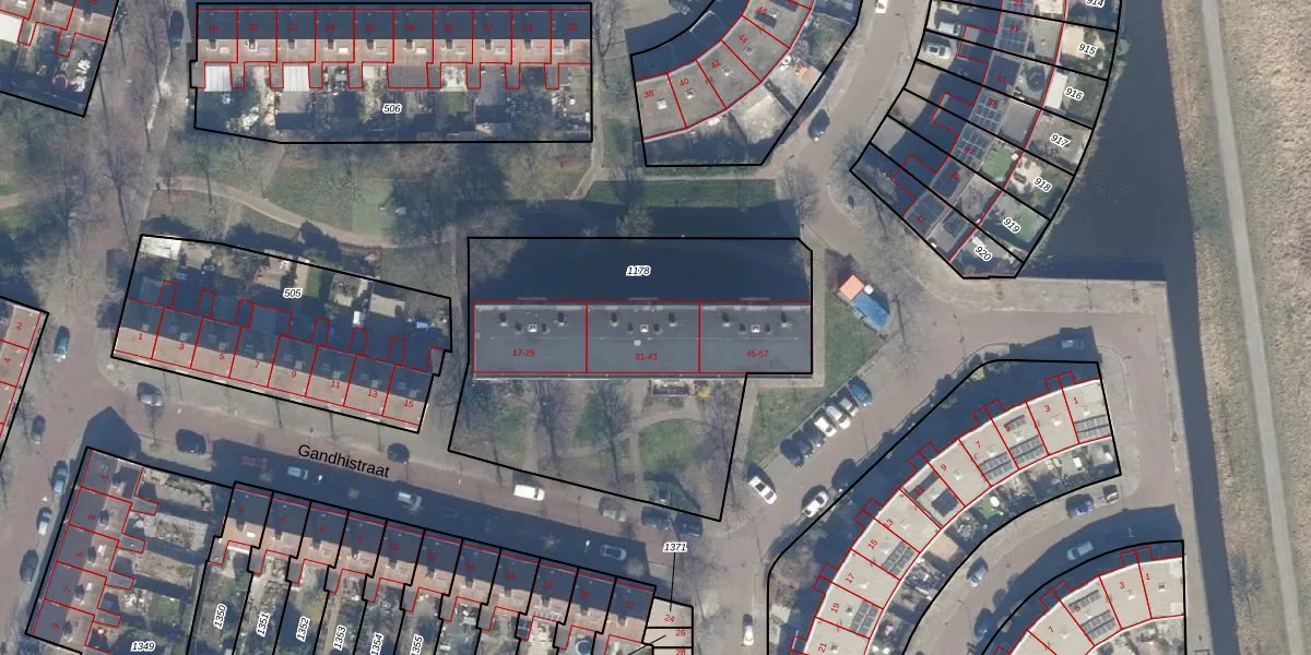 Gandhistraat 43 is gelegen op kadastraal perceel HLM02X1178. Deze kadastrale aanduiding is uniek en wordt gebruikt door het Kadaster om eigendomsrechten en andere zakelijke rechten vast te leggen. Het perceel maakt onderdeel uit van de kadastrale gemeente Haarlem.