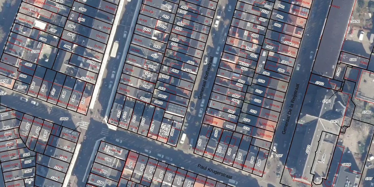 Het perceel waarop Generaal Bothastraat 7 staat heeft een oppervlakte van 88 m². Dit is een klein perceel. De perceeloppervlakte wordt geregistreerd door het Kadaster. Gedetailleerde informatie over de maten van dit perceel kunt u vinden in het rapport Kadastrale kaart met maatvoering van Generaal Bothastraat 7.