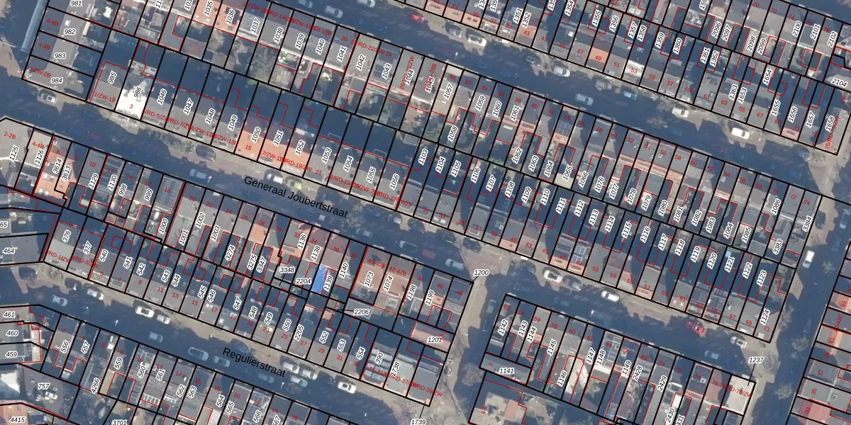 Het perceel waarop Generaal Joubertstraat 31 staat heeft een oppervlakte van 77 m². Dit is een klein perceel. De perceeloppervlakte wordt geregistreerd door het Kadaster. Gedetailleerde informatie over de maten van dit perceel kunt u vinden in het rapport Kadastrale kaart met maatvoering van Generaal Joubertstraat 31.