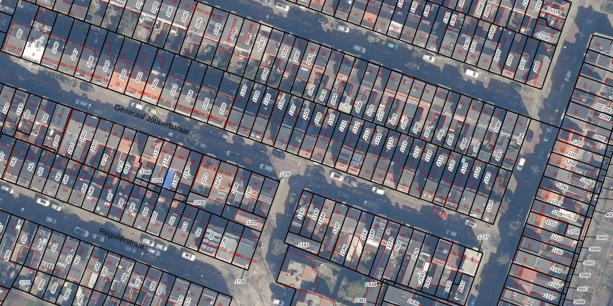 Het perceel waarop Generaal Joubertstraat 41 staat heeft een oppervlakte van 78 m². Dit is een klein perceel. De perceeloppervlakte wordt geregistreerd door het Kadaster. Gedetailleerde informatie over de maten van dit perceel kunt u vinden in het rapport Kadastrale kaart met maatvoering van Generaal Joubertstraat 41.
