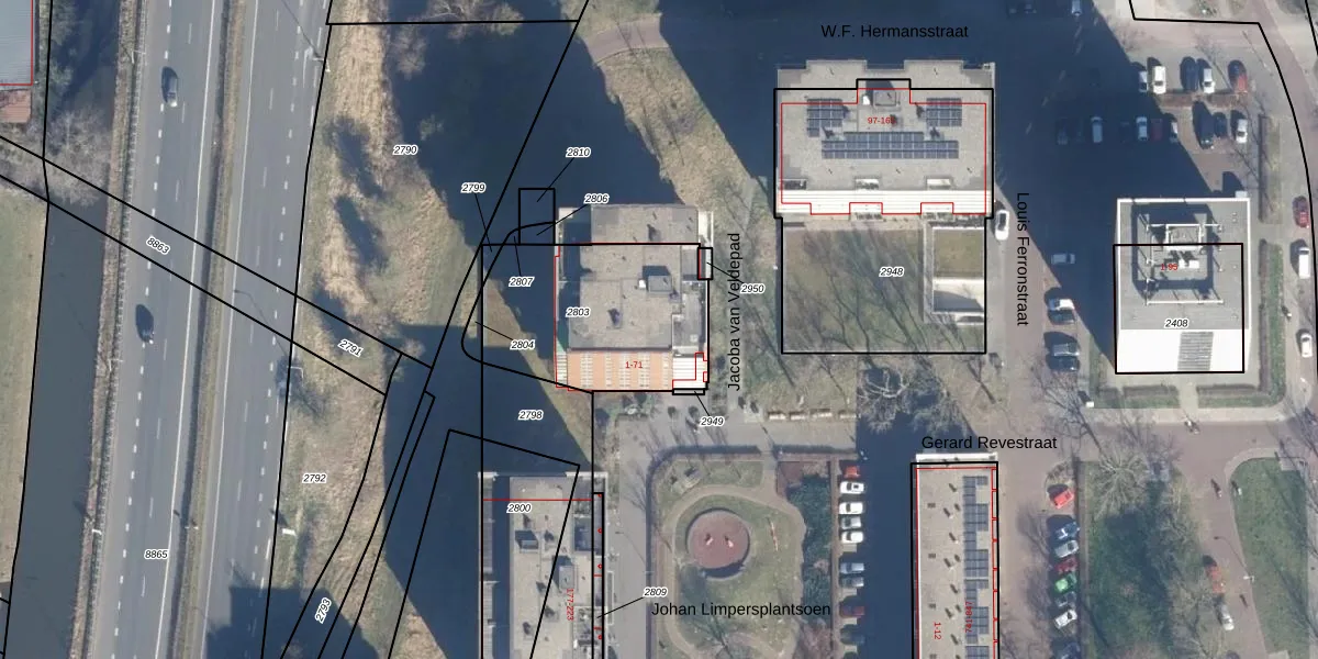 Het perceel waarop Gerard Revestraat 21 staat heeft een oppervlakte van 710 m². Dit is een groot perceel. De perceeloppervlakte wordt geregistreerd door het Kadaster. Gedetailleerde informatie over de maten van dit perceel kunt u vinden in het rapport Kadastrale kaart met maatvoering van Gerard Revestraat 21.