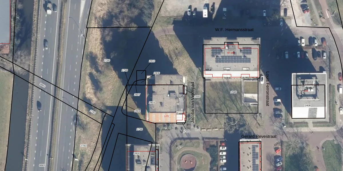 Het perceel waarop Gerard Revestraat 71 staat heeft een oppervlakte van 710 m². Dit is een groot perceel. De perceeloppervlakte wordt geregistreerd door het Kadaster. Gedetailleerde informatie over de maten van dit perceel kunt u vinden in het rapport Kadastrale kaart met maatvoering van Gerard Revestraat 71.