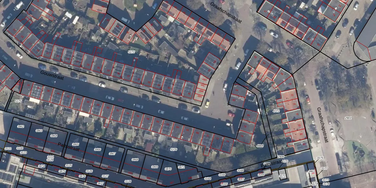 Het perceel waarop Gouwstraat 49 staat heeft een oppervlakte van 5164 m². Dit is een zeer groot perceel. De perceeloppervlakte wordt geregistreerd door het Kadaster. Gedetailleerde informatie over de maten van dit perceel kunt u vinden in het rapport Kadastrale kaart met maatvoering van Gouwstraat 49.
