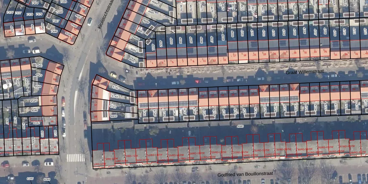 Het perceel waarop Graaf Willemstraat 10 staat heeft een oppervlakte van 94 m². Dit is een klein perceel. De perceeloppervlakte wordt geregistreerd door het Kadaster. Gedetailleerde informatie over de maten van dit perceel kunt u vinden in het rapport Kadastrale kaart met maatvoering van Graaf Willemstraat 10.
