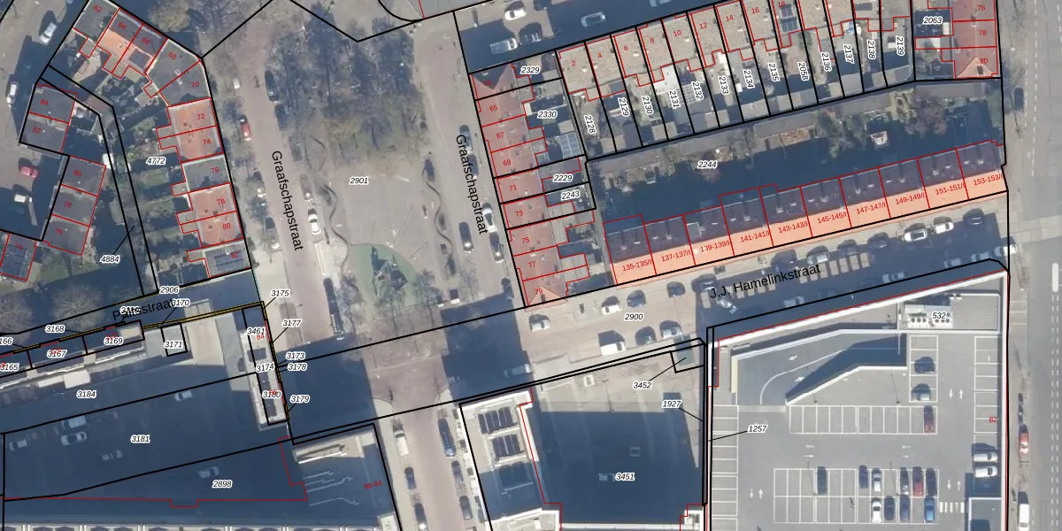 Het perceel waarop Graafschapstraat 77 staat heeft een oppervlakte van 2140 m². Dit is een zeer groot perceel. De perceeloppervlakte wordt geregistreerd door het Kadaster. Gedetailleerde informatie over de maten van dit perceel kunt u vinden in het rapport Kadastrale kaart met maatvoering van Graafschapstraat 77.