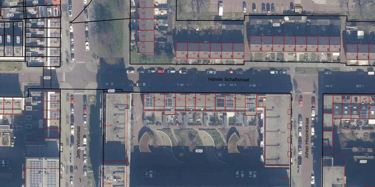 Hannie Schaftstraat 54 is gelegen op kadastraal perceel HLM02Q3402. Deze kadastrale aanduiding is uniek en wordt gebruikt door het Kadaster om eigendomsrechten en andere zakelijke rechten vast te leggen. Het perceel maakt onderdeel uit van de kadastrale gemeente Haarlem.