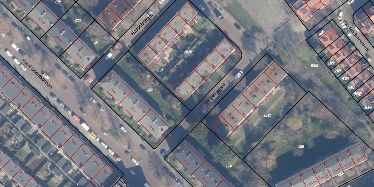 Het perceel waarop Haspelsstraat 1 staat heeft een oppervlakte van 2003 m². Dit is een zeer groot perceel. De perceeloppervlakte wordt geregistreerd door het Kadaster. Gedetailleerde informatie over de maten van dit perceel kunt u vinden in het rapport Kadastrale kaart met maatvoering van Haspelsstraat 1.