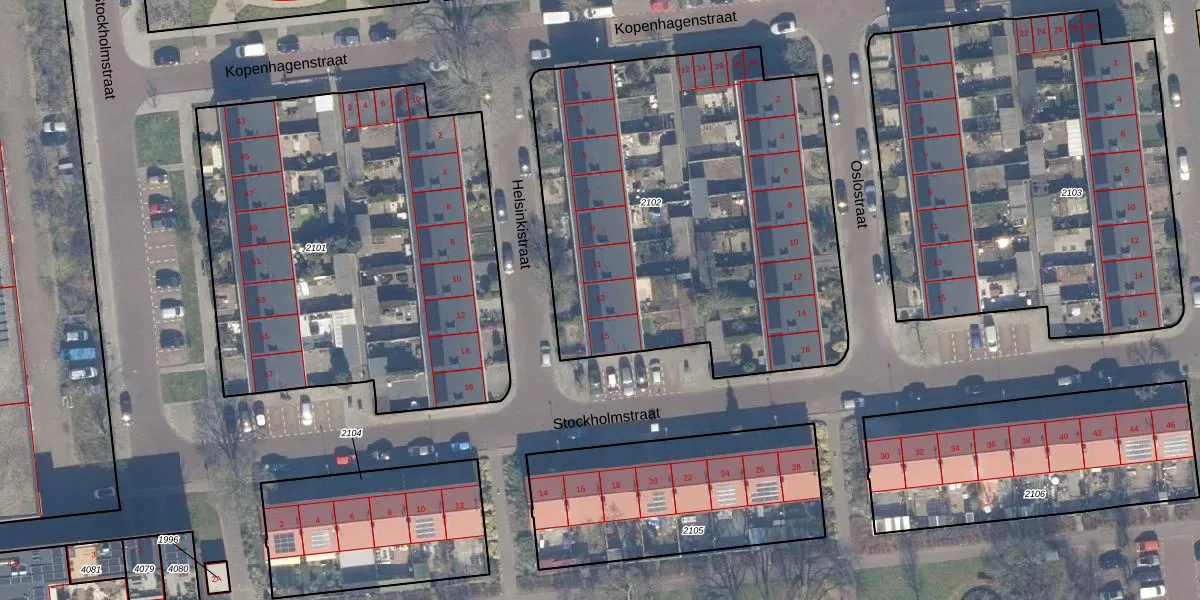 Het perceel waarop Helsinkistraat 13 staat heeft een oppervlakte van 2415 m². Dit is een zeer groot perceel. De perceeloppervlakte wordt geregistreerd door het Kadaster. Gedetailleerde informatie over de maten van dit perceel kunt u vinden in het rapport Kadastrale kaart met maatvoering van Helsinkistraat 13.