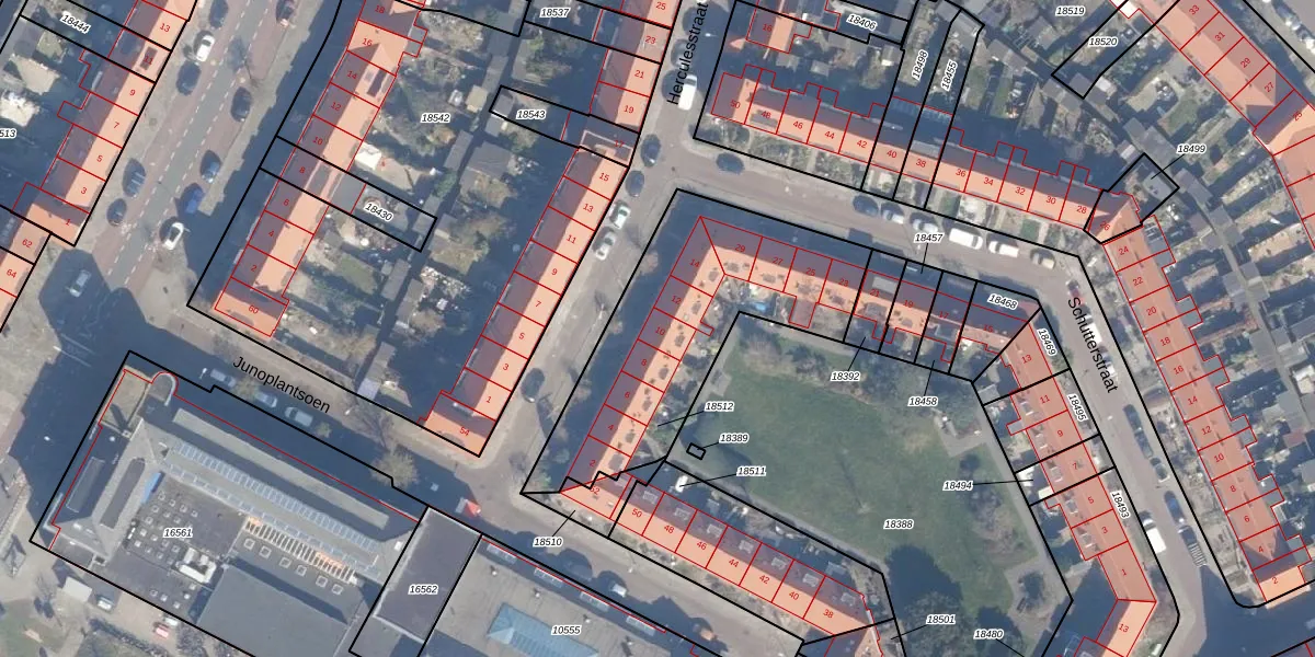 Het perceel waarop Herculesstraat 10 staat heeft een oppervlakte van 1025 m². Dit is een zeer groot perceel. De perceeloppervlakte wordt geregistreerd door het Kadaster. Gedetailleerde informatie over de maten van dit perceel kunt u vinden in het rapport Kadastrale kaart met maatvoering van Herculesstraat 10.