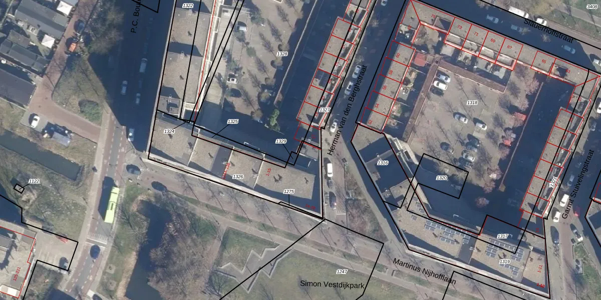 Het perceel waarop Herman van den Berghstraat 15 staat heeft een oppervlakte van 845 m². Dit is een groot perceel. De perceeloppervlakte wordt geregistreerd door het Kadaster. Gedetailleerde informatie over de maten van dit perceel kunt u vinden in het rapport Kadastrale kaart met maatvoering van Herman van den Berghstraat 15.