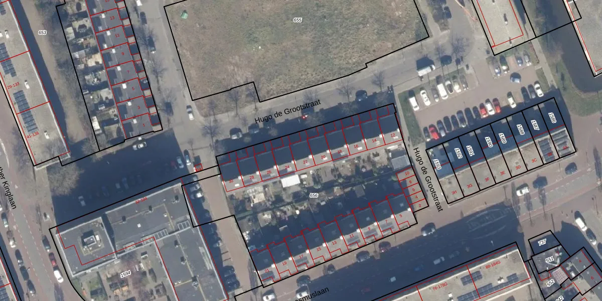 Het perceel waarop Hugo de Grootstraat 22 staat heeft een oppervlakte van 2805 m². Dit is een zeer groot perceel. De perceeloppervlakte wordt geregistreerd door het Kadaster. Gedetailleerde informatie over de maten van dit perceel kunt u vinden in het rapport Kadastrale kaart met maatvoering van Hugo de Grootstraat 22.