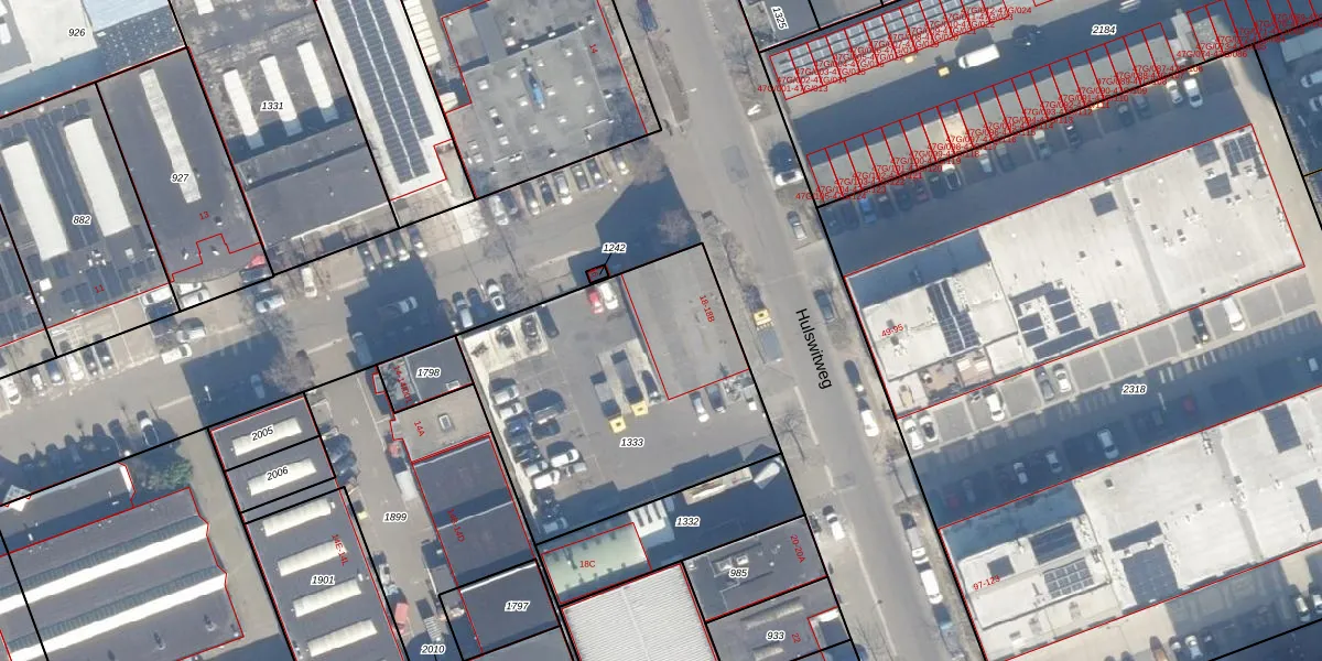 Hulswitweg 18-B is gelegen op kadastraal perceel HLM02N1333. Deze kadastrale aanduiding is uniek en wordt gebruikt door het Kadaster om eigendomsrechten en andere zakelijke rechten vast te leggen. Het perceel maakt onderdeel uit van de kadastrale gemeente Haarlem.