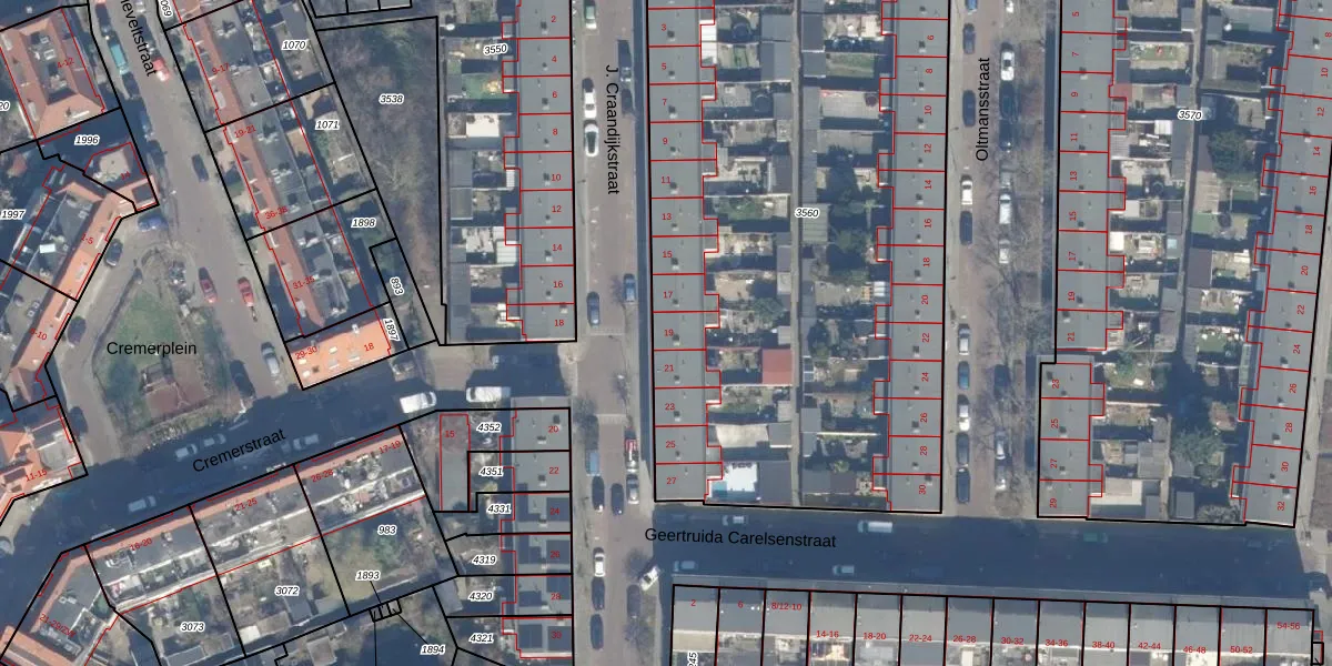 Het perceel waarop J. Craandijkstraat 19 staat heeft een oppervlakte van 3774 m². Dit is een zeer groot perceel. De perceeloppervlakte wordt geregistreerd door het Kadaster. Gedetailleerde informatie over de maten van dit perceel kunt u vinden in het rapport Kadastrale kaart met maatvoering van J. Craandijkstraat 19.