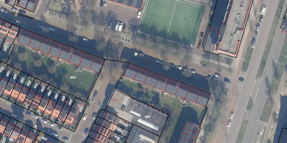 Het perceel waarop Jac. van Looystraat 40 staat heeft een oppervlakte van 3360 m². Dit is een zeer groot perceel. De perceeloppervlakte wordt geregistreerd door het Kadaster. Gedetailleerde informatie over de maten van dit perceel kunt u vinden in het rapport Kadastrale kaart met maatvoering van Jac. van Looystraat 40.
