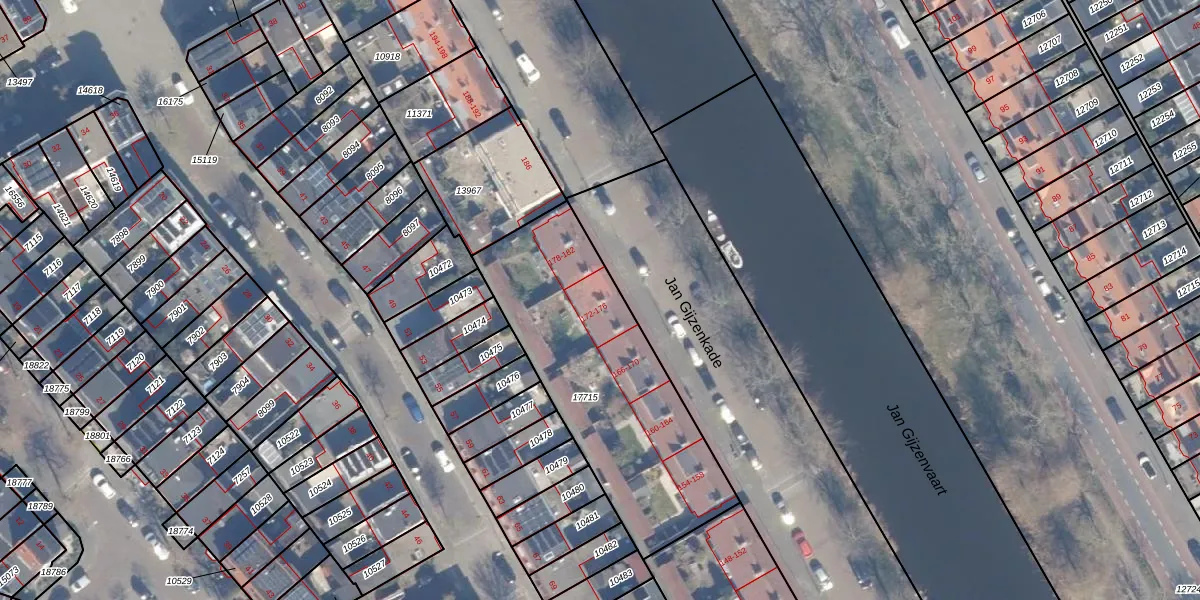 Het perceel waarop Jan Gijzenkade 174 staat heeft een oppervlakte van 1102 m². Dit is een zeer groot perceel. De perceeloppervlakte wordt geregistreerd door het Kadaster. Gedetailleerde informatie over de maten van dit perceel kunt u vinden in het rapport Kadastrale kaart met maatvoering van Jan Gijzenkade 174.