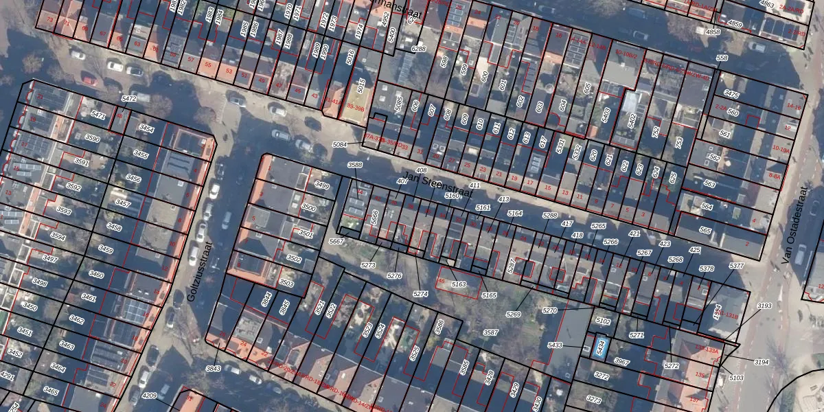 Jan Steenstraat 38 is gelegen op kadastraal perceel HLM01A408. Deze kadastrale aanduiding is uniek en wordt gebruikt door het Kadaster om eigendomsrechten en andere zakelijke rechten vast te leggen. Het perceel maakt onderdeel uit van de kadastrale gemeente Haarlem.