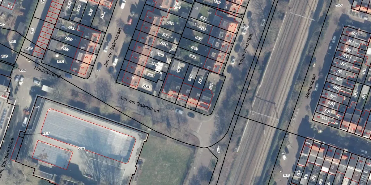 Jan van Galenstraat 96 is gelegen op kadastraal perceel HLM02T2931. Deze kadastrale aanduiding is uniek en wordt gebruikt door het Kadaster om eigendomsrechten en andere zakelijke rechten vast te leggen. Het perceel maakt onderdeel uit van de kadastrale gemeente Haarlem.