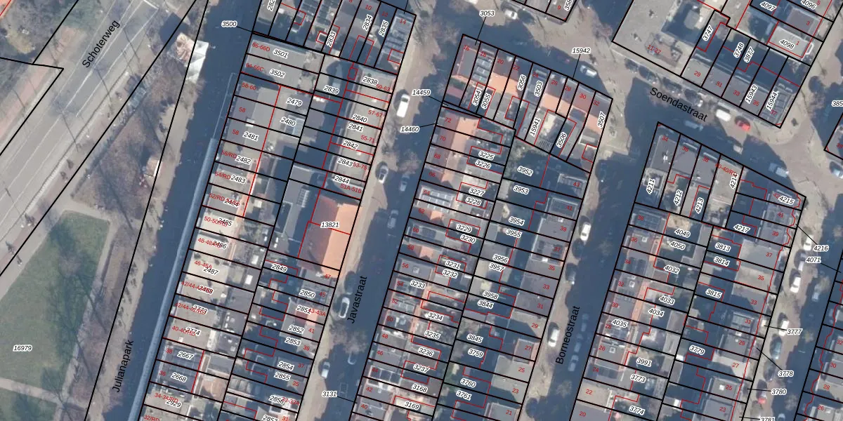 Het perceel waarop Javastraat 62 staat heeft een oppervlakte van 83 m². Dit is een klein perceel. De perceeloppervlakte wordt geregistreerd door het Kadaster. Gedetailleerde informatie over de maten van dit perceel kunt u vinden in het rapport Kadastrale kaart met maatvoering van Javastraat 62.