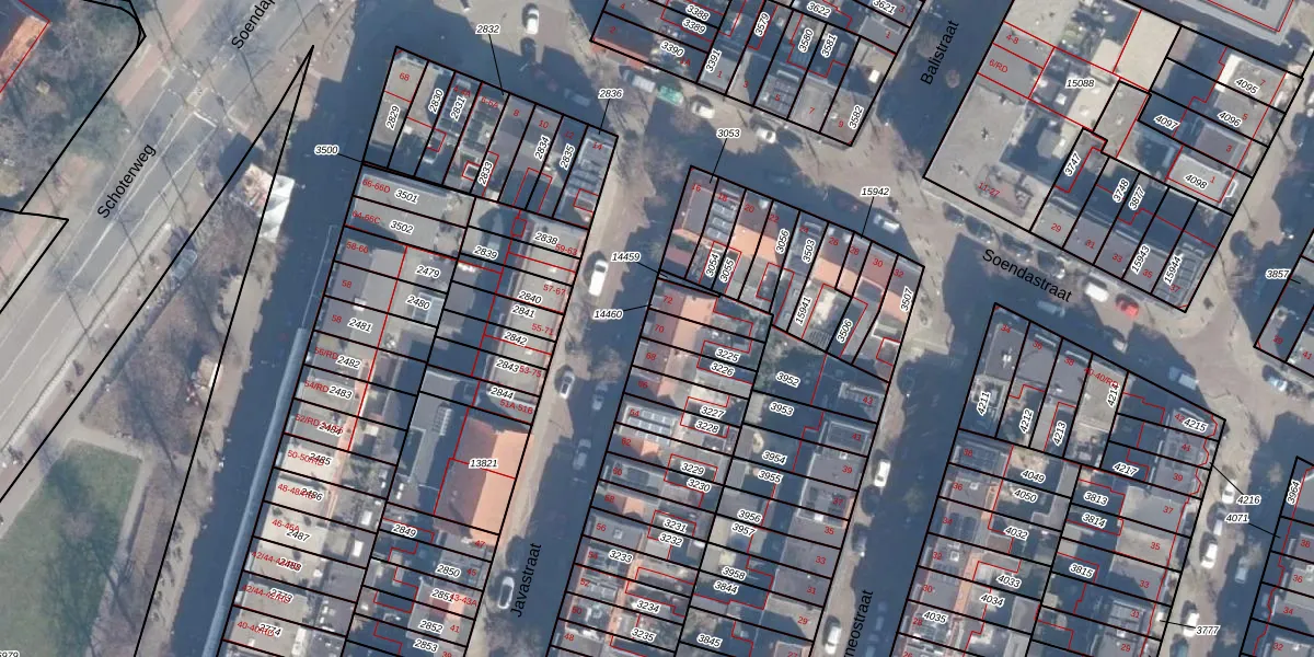 Het perceel waarop Javastraat 70 staat heeft een oppervlakte van 84 m². Dit is een klein perceel. De perceeloppervlakte wordt geregistreerd door het Kadaster. Gedetailleerde informatie over de maten van dit perceel kunt u vinden in het rapport Kadastrale kaart met maatvoering van Javastraat 70.
