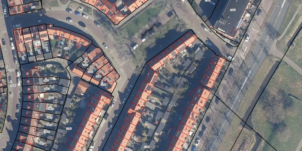 Het perceel waarop Jephtaplein 3 staat heeft een oppervlakte van 7530 m². Dit is een zeer groot perceel. De perceeloppervlakte wordt geregistreerd door het Kadaster. Gedetailleerde informatie over de maten van dit perceel kunt u vinden in het rapport Kadastrale kaart met maatvoering van Jephtaplein 3.