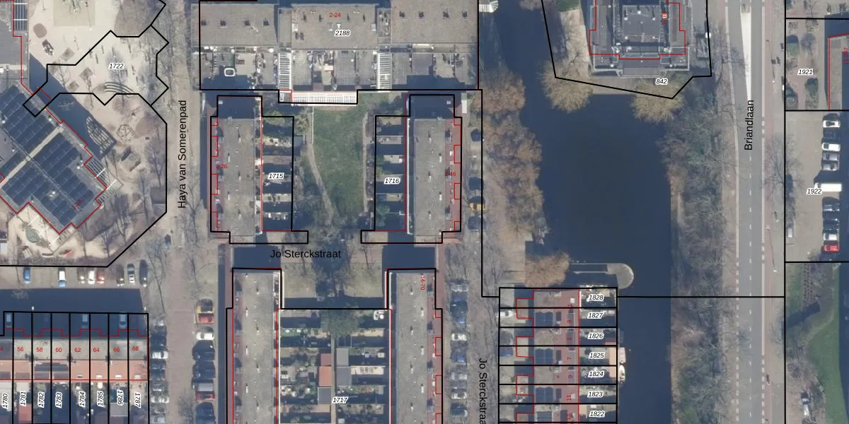 Het perceel waarop Jo Sterckstraat 46 staat heeft een oppervlakte van 645 m². Dit is een groot perceel. De perceeloppervlakte wordt geregistreerd door het Kadaster. Gedetailleerde informatie over de maten van dit perceel kunt u vinden in het rapport Kadastrale kaart met maatvoering van Jo Sterckstraat 46.