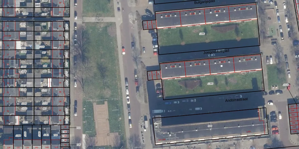 Het perceel waarop Joegoslaviëpad 2 staat heeft een oppervlakte van 1765 m². Dit is een zeer groot perceel. De perceeloppervlakte wordt geregistreerd door het Kadaster. Gedetailleerde informatie over de maten van dit perceel kunt u vinden in het rapport Kadastrale kaart met maatvoering van Joegoslaviëpad 2.