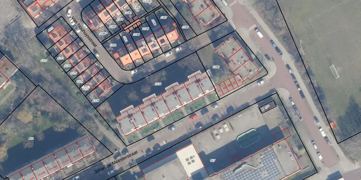 Het perceel waarop Johan de Meesterstraat 35-C staat heeft een oppervlakte van 1823 m². Dit is een zeer groot perceel. De perceeloppervlakte wordt geregistreerd door het Kadaster. Gedetailleerde informatie over de maten van dit perceel kunt u vinden in het rapport Kadastrale kaart met maatvoering van Johan de Meesterstraat 35-C.