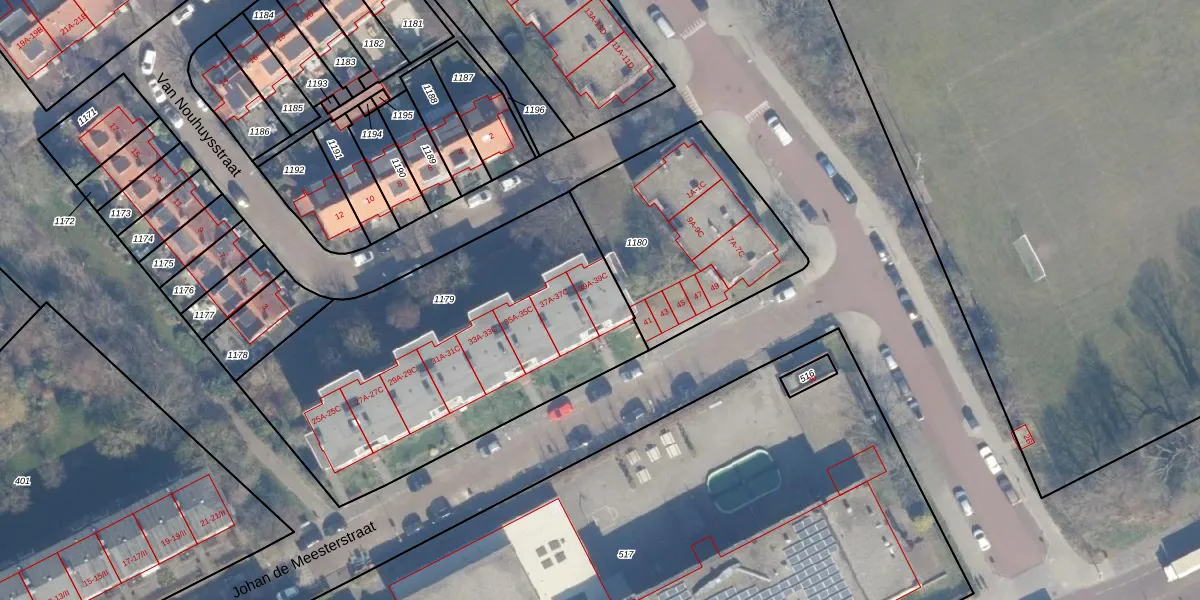 Het perceel waarop Johan de Meesterstraat 39-B staat heeft een oppervlakte van 1823 m². Dit is een zeer groot perceel. De perceeloppervlakte wordt geregistreerd door het Kadaster. Gedetailleerde informatie over de maten van dit perceel kunt u vinden in het rapport Kadastrale kaart met maatvoering van Johan de Meesterstraat 39-B.