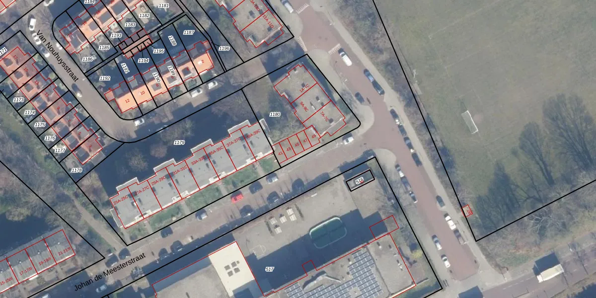 Het perceel waarop Johan de Meesterstraat 45 staat heeft een oppervlakte van 827 m². Dit is een groot perceel. De perceeloppervlakte wordt geregistreerd door het Kadaster. Gedetailleerde informatie over de maten van dit perceel kunt u vinden in het rapport Kadastrale kaart met maatvoering van Johan de Meesterstraat 45.