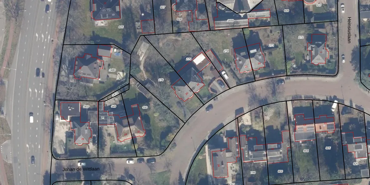 Het perceel waarop Johan de Wittlaan 20 staat heeft een oppervlakte van 815 m². Dit is een groot perceel. De perceeloppervlakte wordt geregistreerd door het Kadaster. Gedetailleerde informatie over de maten van dit perceel kunt u vinden in het rapport Kadastrale kaart met maatvoering van Johan de Wittlaan 20.