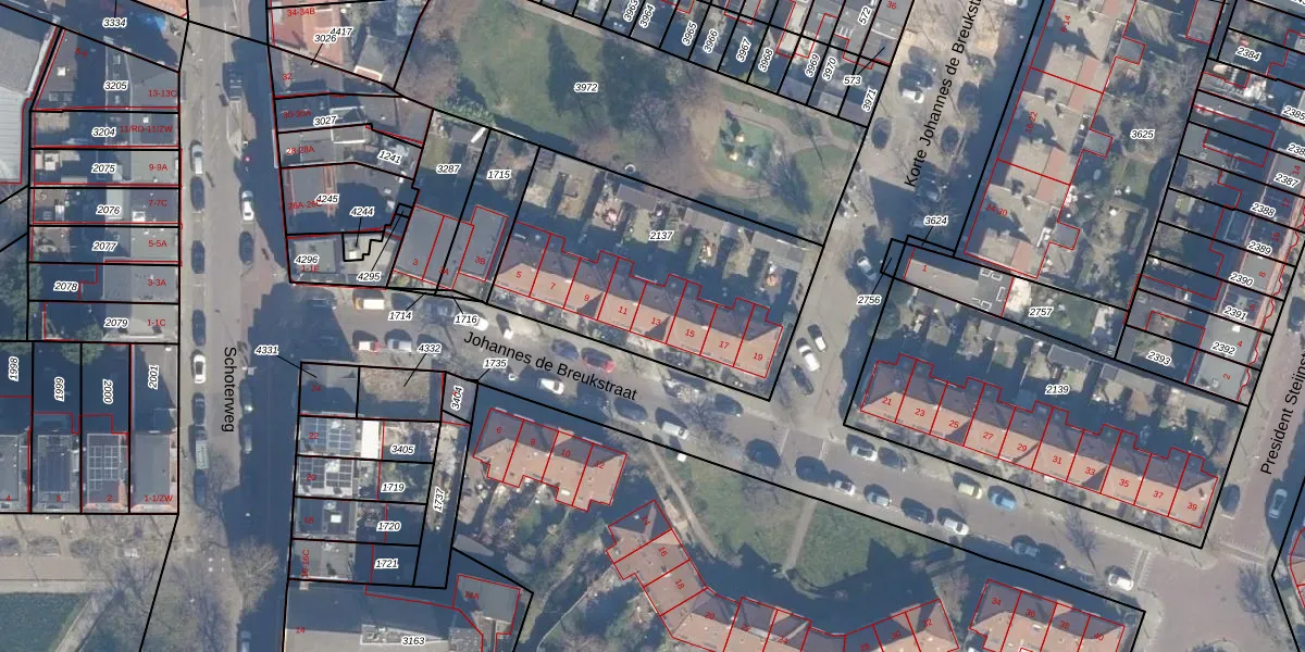 Het perceel waarop Johannes de Breukstraat 13 staat heeft een oppervlakte van 1150 m². Dit is een zeer groot perceel. De perceeloppervlakte wordt geregistreerd door het Kadaster. Gedetailleerde informatie over de maten van dit perceel kunt u vinden in het rapport Kadastrale kaart met maatvoering van Johannes de Breukstraat 13.