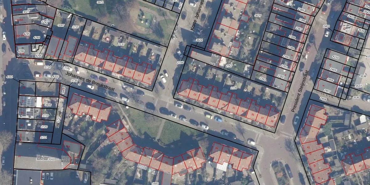 Het perceel waarop Johannes de Breukstraat 21 staat heeft een oppervlakte van 1355 m². Dit is een zeer groot perceel. De perceeloppervlakte wordt geregistreerd door het Kadaster. Gedetailleerde informatie over de maten van dit perceel kunt u vinden in het rapport Kadastrale kaart met maatvoering van Johannes de Breukstraat 21.