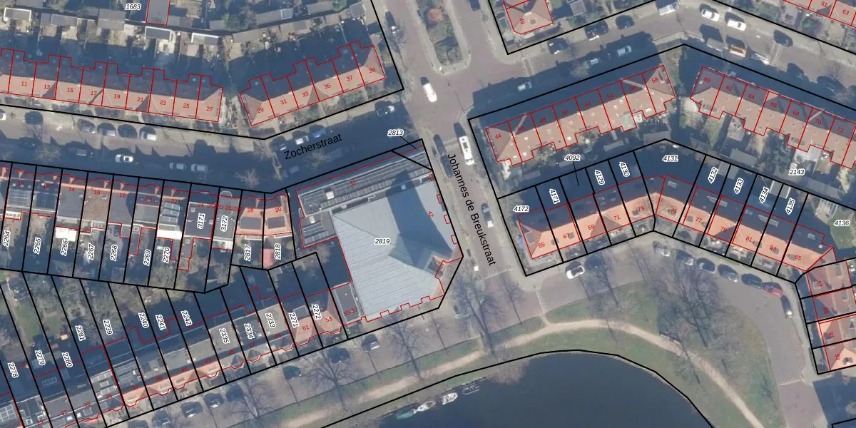 Het perceel waarop Johannes de Breukstraat 42 staat heeft een oppervlakte van 1217 m². Dit is een zeer groot perceel. De perceeloppervlakte wordt geregistreerd door het Kadaster. Gedetailleerde informatie over de maten van dit perceel kunt u vinden in het rapport Kadastrale kaart met maatvoering van Johannes de Breukstraat 42.