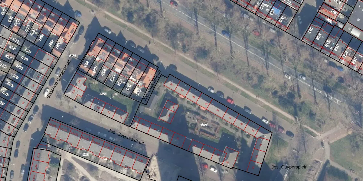 Het perceel waarop Jos. Cuypersstraat 50 staat heeft een oppervlakte van 2220 m². Dit is een zeer groot perceel. De perceeloppervlakte wordt geregistreerd door het Kadaster. Gedetailleerde informatie over de maten van dit perceel kunt u vinden in het rapport Kadastrale kaart met maatvoering van Jos. Cuypersstraat 50.
